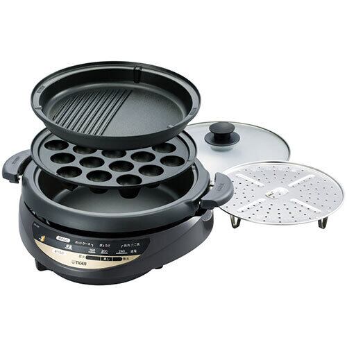 蒸し物料理も楽しめて多彩に活躍。波形プレート、たこ焼きプレート19個、蒸し台、深なべ付。コードの長さ約18m。消費電力1100W。