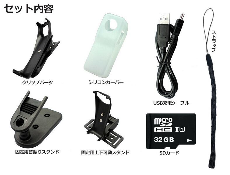 USBケーブル、ストラップ、半透明(シリコン)カバー、クリップ、固定用首振りスタンド、固定用上下可動スタンド、SDカード(32GB)、取扱説明書